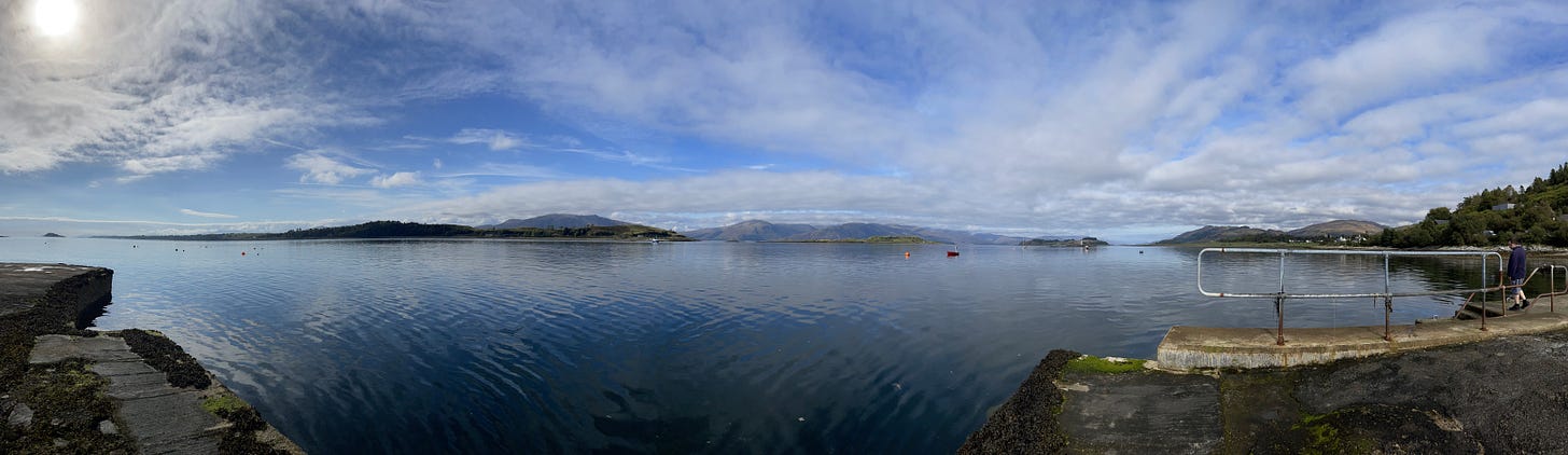 While I was visiting the magical west coast of Scotland last week, my friend and host Carole drove me hither and thither around the high roads and low roads to Port Appin, a small village on the shores of Loch Linnhe where we sat eating a superb seafood lunch in the unexpected but very welcome September sunshine. The table we chose was a very special one as it was Carole’s father’s favourite table and the one where he sat every time he visited The Pier House Hotel. Even though Alzheimers’s took a hold in later years he never lost the love that he felt for this place, over time he had forged a deep connection to the calm waters stretching over to the Isle of Lismore and the Sgeir Bhuidhen Lighthouse, standing guard at the foot of the majestic rolling mountains in the distance.